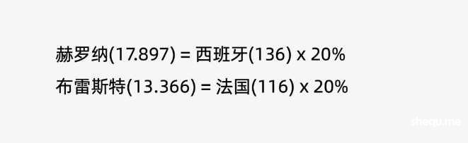因此,从未参加过欧战的西甲球队赫罗纳和法甲球队布雷斯特的俱乐部系数其实分别是西班牙和法国的协会系数的20%,分别是17.897(136*0.2)和13.366(116*0.2)。